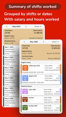 • PDF Export: Generate timesheets, pay stubs, payroll statements and work shift calendars with one tap.
