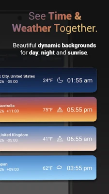 Enjoy a beautiful interface that changes with the day, visually showing sunrise, daylight, sunset and night phases for every location.