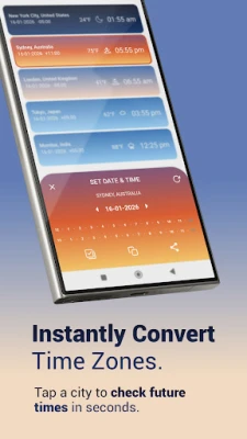 - Quick Convert: Select any city from your list to convert time instantly, then copy or share the result with one tap.