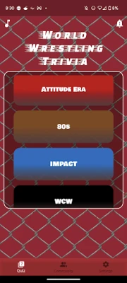 Wrestling Trivia app, select from a variety of quizzes to test your wrestling knowledge, each quiz has 20 questions and a time limit of 30 seconds per question. Scores are recorded on our leaderboards. Questions and Quizzes are updated every few weeks so you will never run out of questions, We also have special quizzes on specific wrestling topics such as Attitude Era, WCW and many more to come, these quizzes are rotated frequently to provide more content.