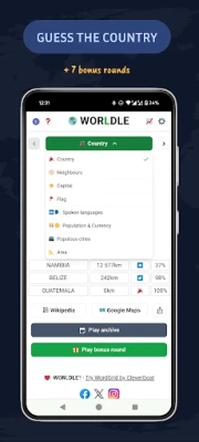 After the country/territory is revealed, you can choose which bonus rounds to play – Neighbours (guess the neighbouring countries), Capital (guess the capital), Flag (guess the flag), Spoken languages (guess the 2 most spoken languages and learn how to say “My name is” is each of them), Population & Currency (guess the population and currency in a multiple choice quiz), Populous cities (put the 4 most populous cities in the correct order), Area (guess the size of the country).