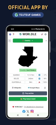 Please, note: there are several copycat apps of this game but this is the official Worldle from Teuteuf Games (teuteuf.fr).