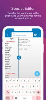 Write your Own Song and Rhymes Finder app has a database of 470,000 words where you can search for perfect words, the extensive rhymes which give you more choices and help you to express yourself in a more creative way. You can also search rhymes in English and on Phrases that Rhymes.