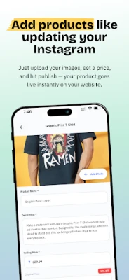 Upload photos, set a price, write a short description, and publish. Your products appear instantly on your website and store.
