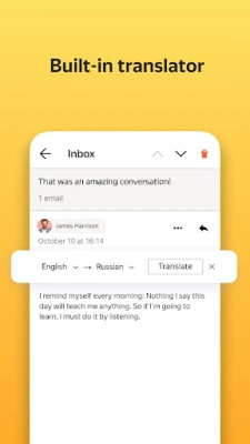 - Work with email on the go: see attachments, listen to an email if you're busy, and respond with a template message in one touch. Yandex Mail has a built-in translator for incoming and outgoing messages. You can read an email in a foreign language without any difficulties.