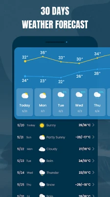 Track the weather forecast for the next 30 days, learn about the weather in advance, and plan ahead of future clothing, transportation, or outdoor activities.