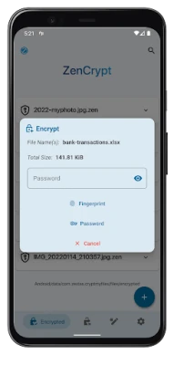 A: ZenCrypt supports encrypting using an alphanumerical password, or using a fingerprint, if your device supports it.