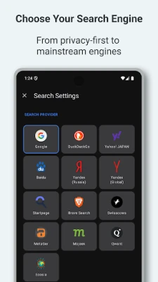 Choose from 13 engines including Google, DuckDuckGo, Brave, Startpage, Ecosia, Qwant, Mojeek, MetaGer, Swisscows, Yahoo Japan, Baidu, and Yandex.