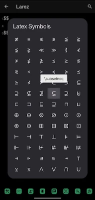 This plugin allows you to insert supported latex variables from the editor toolbar. After clicking on the plugin, a dialog box will be shown after that click on the latex symbol to add it to your notes.