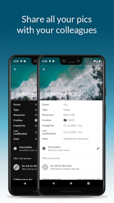 Access your camera and upload pics and videos straight into your Drive app, share any kind of files and manage the share with other users, defining access rights and visibility.
