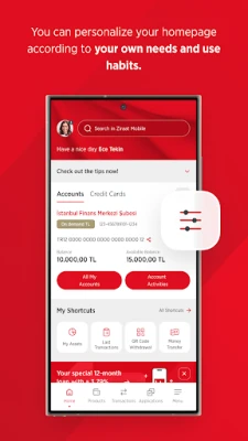 • Through the information panels on the main page; You can easily access many information / basic products / transactions such as Accounts/Cards, Upcoming Instructions, Last Transactions, Financial Agenda and personalize these information panels according to your own needs and frequency of use with the Home Page Editing function in the Profile and Settings menu. Thanks to the advanced search feature on the homepage, you can easily access the transactions you want to perform.
