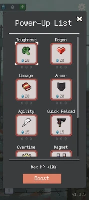 Buffs and Items: Temporary buffs, such as increased attack, double coins, or damage resistance, are available. Health packs, magnets, and other items drop from defeated enemies to aid survival.