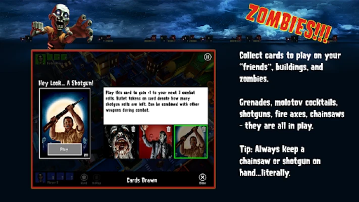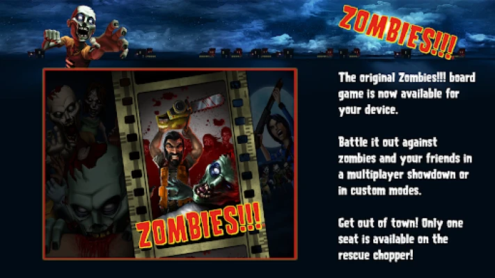 Take on the Standard Game Mode, building your game board one tile at a time and killing zombies within the confines of the official Zombies!!! rules. Generated Town Mode drops the players into a premade town with Zombies in wait to make you their next meal. Survival Mode is the ultimate test: You versus a town full of zombies! How long can you last?