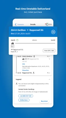 • Ticket purchase via the timetable query (across Switzerland), including for travel companions, dogs and bikes